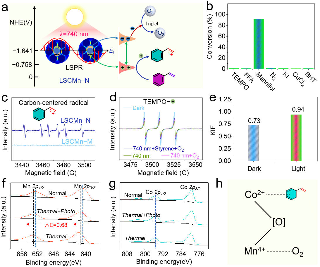 机理研究表明,在LSPR效应作用下,LaSrCoMnO6在可见光的激发下即可产生大量的空穴和电子。其中,空穴活化苯乙烯得到苯乙烯衍生C+化合物是其环氧化的关键,而电子在温和反应条件下与吸附氧结合形成单线态氧,进而与Mn物种形成氧化中心,这两步分别促进了苯乙烯的转化和环氧苯乙烷的合成。研究表明以可见光为驱动、氧气为氧化剂,在纳米LaSrCoMnO6催化剂上实现了苯乙烯的高效转化。苯乙烯转化率超过99.9%,环氧苯乙烷选择性达91.3%,TOF值为22.3 h-1,为烯烃环氧化提供了新的光热协同催化策略。