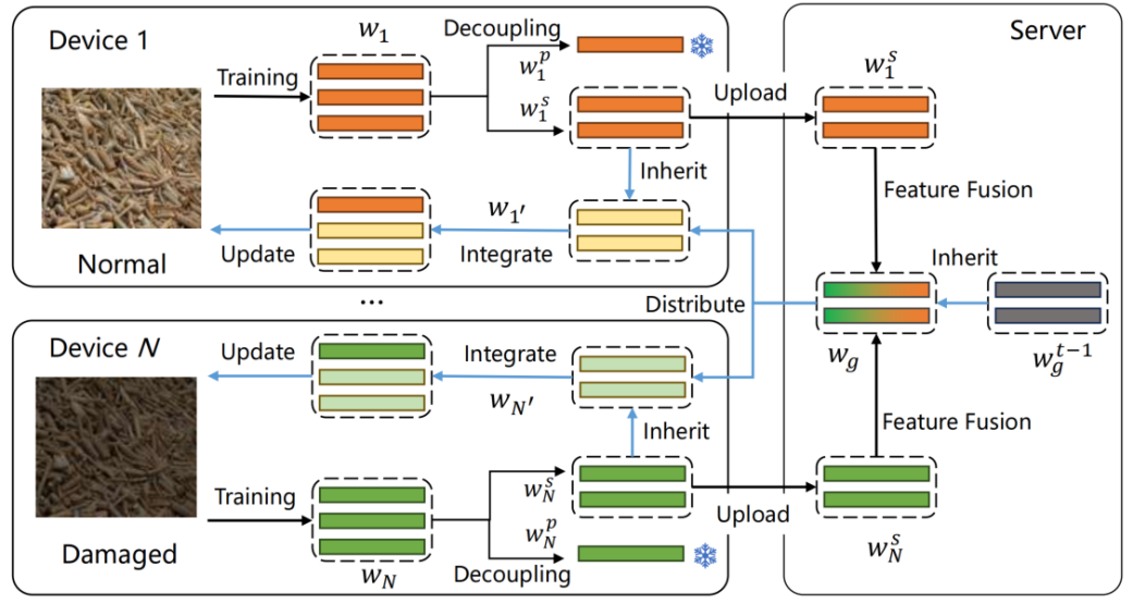 针对工业场景中的数据和特征异构性问题,团队在《IEEE Transactions on Industrial Informatics》上发表的研究工作FedCLAM聚焦于智能物联网场景下的异构数据建模与高效协同学习问题。研究针对工业物联网中设备类型多样、数据分布差异显著的特点,提出了一种新型联邦学习框架,通过精细化建模客户端差异与优化全局—本地协同机制,有效提升了系统整体学习性能和公平性。在开源废钢检查数据集以及自采废钢识别数据集上的实验结果表明,该方法在多个工业智能应用场景中均取得了显著性能提升,为联邦学习在工业级物联网系统中的落地应用提供了有力支撑。