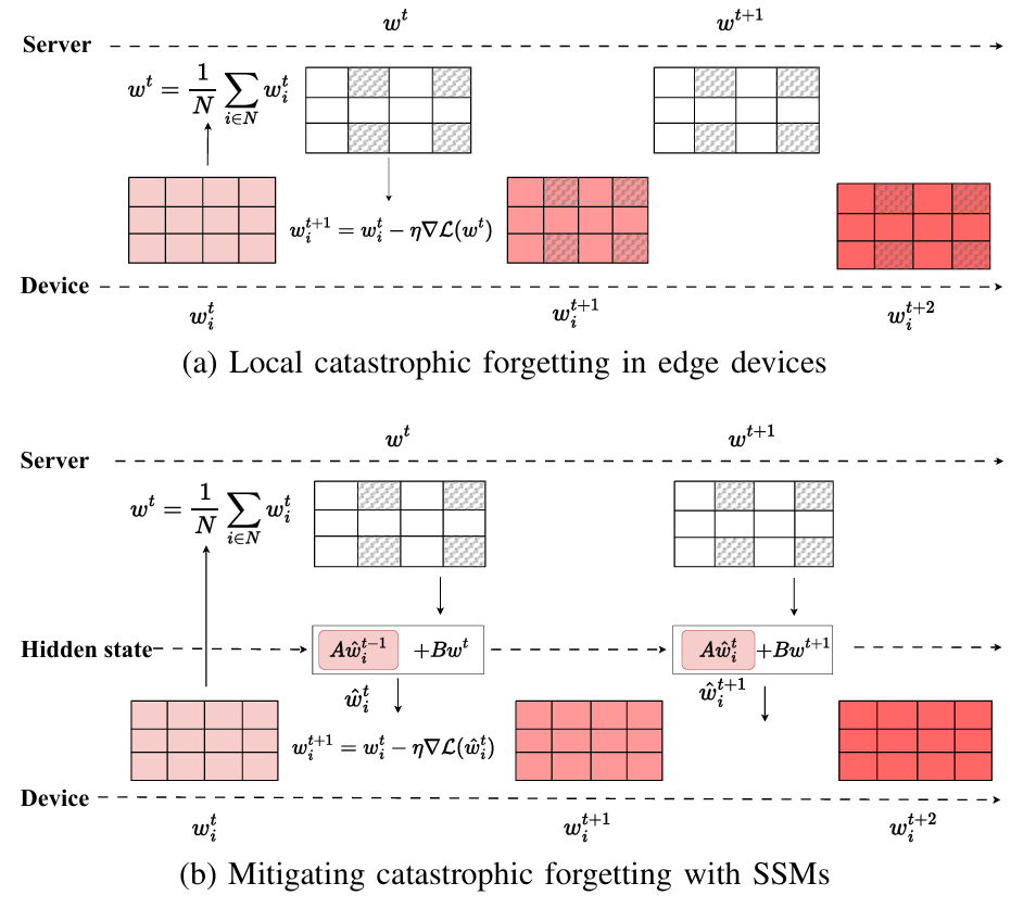 针对边缘设备个性化联邦学习中的双向灾难性遗忘问题,团队在《IEEE Transactions on Mobile Computing》上提出了一种面向复杂时序建模的联邦学习新方法(FedSSM)。该方法从状态空间建模的角度出发,有效提升了联邦环境下对长时序依赖关系的刻画能力,在保证数据隐私的同时显著增强了模型在非独立同分布(Non-IID)场景下的稳定性与泛化性能。在多个公开数据集上的实验结果表明,该方法在多种时序预测与移动计算任务中均优于现有主流联邦学习算法,展现出良好的鲁棒性与实用价值。