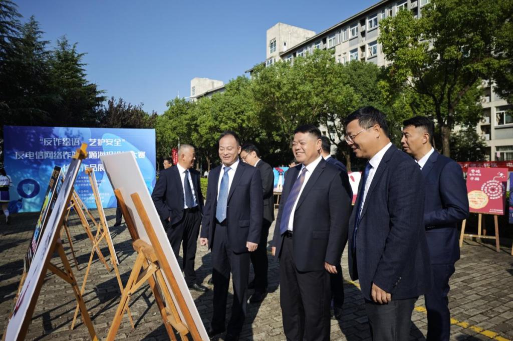 10月22日上午,“反诈‘绘’语,艺护安全”——反电信网络诈骗主题海报设计大赛优秀作品展在秀山校区田径场开展。校领导陆林、曾杰、王俊、郑啸、吴春雷、闵凡飞、郑利平、张世宏,党办校办、党委组织部、党委宣传部、学生工作部、研究生工作部、安全保卫部、艺术与设计学院等单位负责人现场观展。