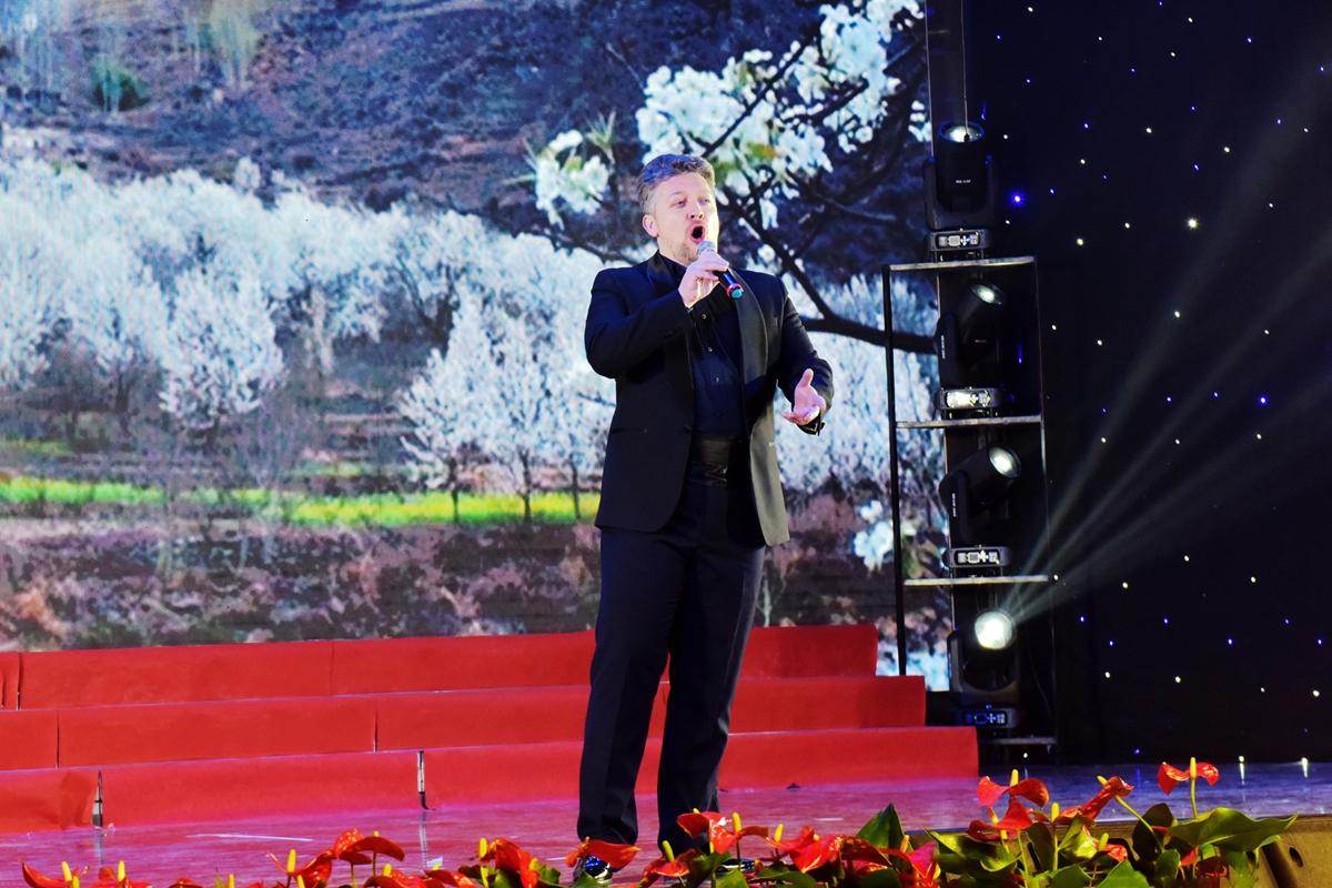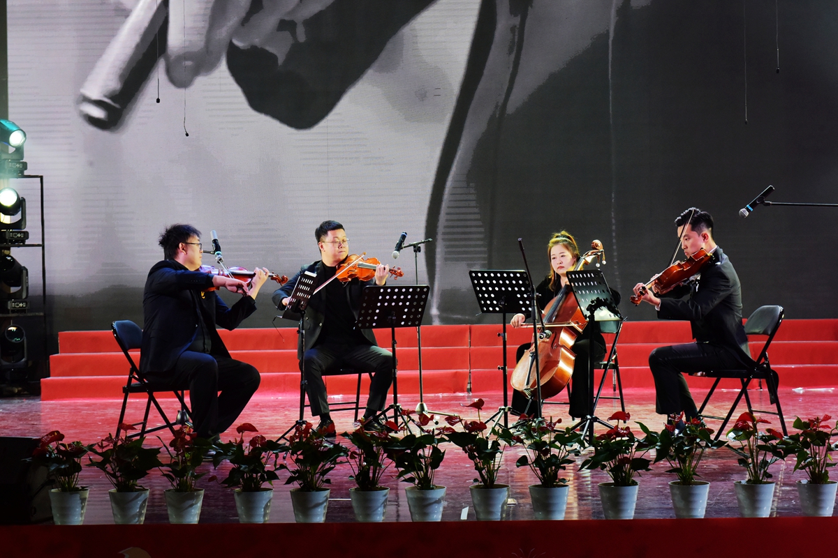 音乐会在庄严恢弘的交响序曲《在太行山上》中拉开帷幕。安徽工业大学交响乐团倾情演绎钢琴协奏曲《黄河颂》,激昂的旋律传递出中华民族不屈的精神力量;AI艺术小品《追思》以科技融合艺术的方式,创新表达对英烈的深切缅怀;古筝合奏《洪湖颂》、二胡齐奏《游击队歌》等经典曲目,再现革命年代的豪情与智慧;特邀嘉宾俄罗斯男低音歌唱家安德烈·布拉霍夫斯基深情献唱《莫斯科郊外的晚上》《喀秋莎》,Vida室内乐团演绎《辛德勒的名单》《闲聊波尔卡》,传递跨越国界的和平之声。国家级非遗传承人陶小妹带来的当涂民歌,彰显马鞍山地域文化的深厚底蕴。音乐剧《跨越时空的军礼》、流行歌曲联唱、大合唱《我们的新时代》等,深情抒发师生奋进新征程、建功新时代的青春信念与使命担当。
