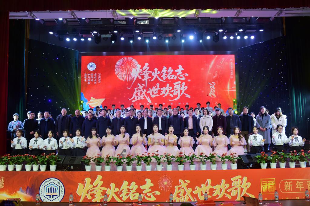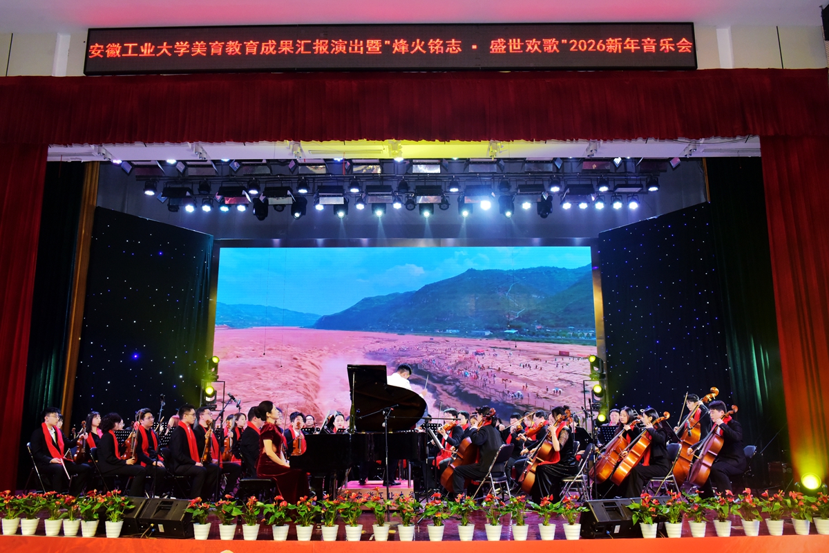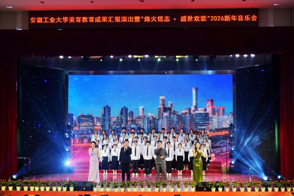 12月29日晚,安徽工业大学美育教育成果汇报演出暨“烽火铭志·盛世欢歌”2026新年音乐会在秀山校区大学生活动中心浓情上演。校领导曾杰、王俊、郑啸、吴春雷、闵凡飞、郑利平、张世宏出席,校党委常委,相关职能部门、学院党政负责人,兄弟学校音乐协会嘉宾,美育共建单位、优质生源基地中学代表以及师生代表共同观看。