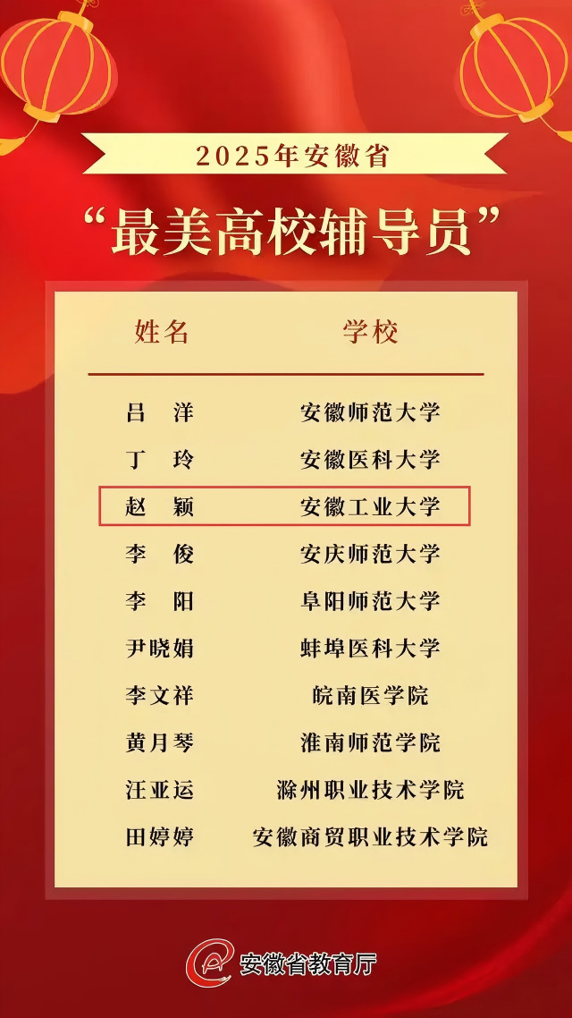 近日,中共安徽省委宣传部、中共安徽省委教育工委联合公布2025年安徽省“最美高校辅导员”和“最美大学生”评选结果。我校管理科学与工程学院赵颖老师和材料科学与工程学院博士研究生张泽同学分别荣获“最美高校辅导员”和“最美大学生”称号。