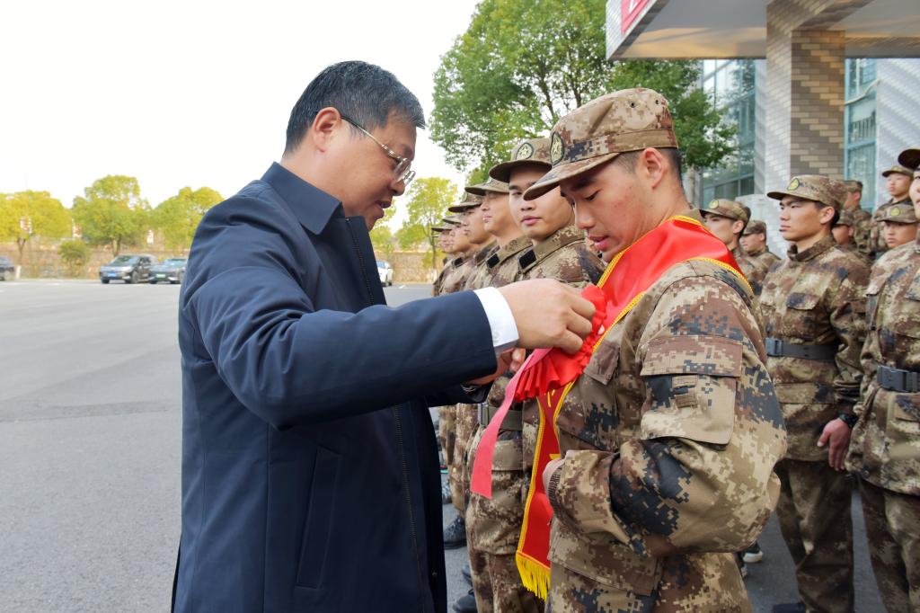 王俊一行为入伍新兵佩戴“光荣入伍”红花绶带,送上役前教育慰问品和入伍纪念品。入伍新兵们深感责任重大、使命光荣,纷纷表示一定牢记学校的嘱托,服从命令、听从指挥、刻苦训练、努力学习,争取在部队中建功立业,为校争光。