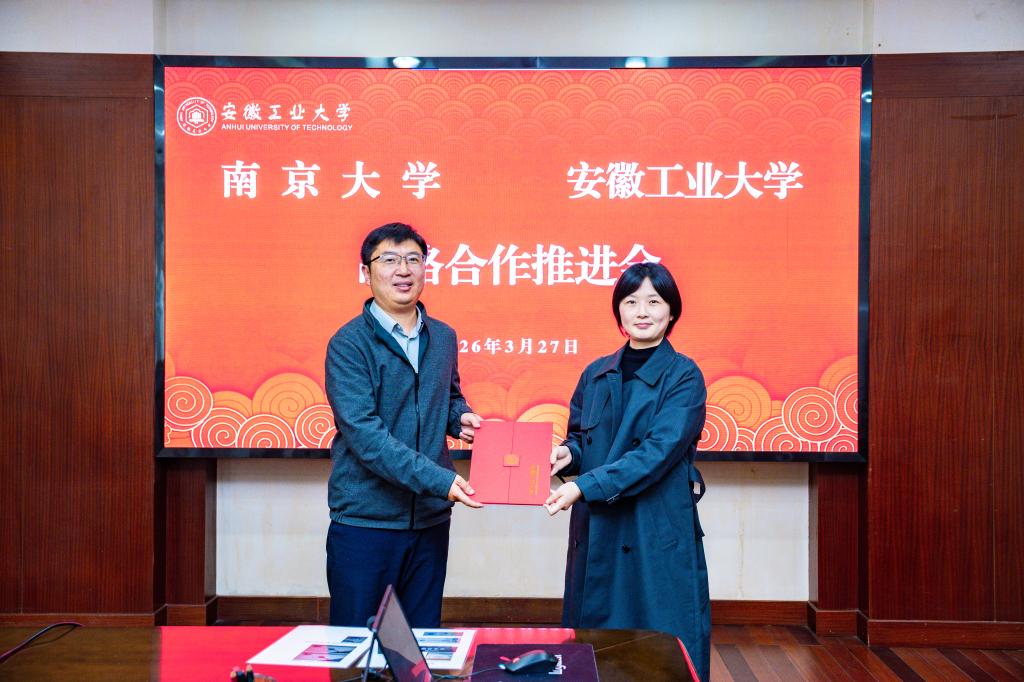 索文斌表示,南京大学与安徽工业大学山水相依、情谊绵长,近年来在国家战略需求和区域经济布局的牵引下密切交流、多维互动,以开阔思路和务实举措推动战略合作协议落地见效,赢得了社会广泛赞誉。索文斌强调,面向未来,希望两校推动战略合作提质升级,开创共赢发展新局面。要在提升办学实力上聚智聚力,围绕优势特色学科融通、高端科研平台团队共建、关键核心技术协同攻关等方面持续发力,不断提升两校服务“大国重器”的支撑力贡献力。要在培育时代新人上同心同向,建立两校青年思想引领、创新创造、实践锻炼的常态化联动机制,引导两校学子既在专业上“深耕”,更在信仰上“铸魂”,在互学互鉴中心系国家事、肩扛国家责。要在传播精神文化上互联互通,依托匠心对话、经典传诵、艺术展演、名家讲坛等载体,促进两校精神价值理念深度交融,高质量推进科技教育与人文教育协同发展,让既有科学精神、又有人文情怀成为师生的共同追求。要在助力现代化产业体系建设上共建共享,聚焦经营性国有资产管理、校办产业规范运营、科技成果市场化运作等方面开展经验共享、模式共建,促进两校创新资源高效联动,提升成果转化率与经济效益。