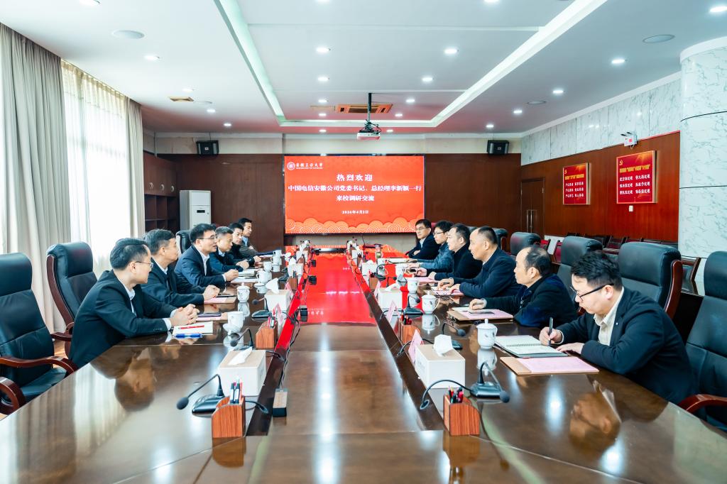 曾杰代表学校对李新颖一行表示欢迎,对中国电信安徽公司一直以来给予我校建设发展的关心支持表示感谢,并从办学历史、人才培养、学科专业建设、科学研究、师资力量等方面简要介绍了我校基本情况。曾杰指出,当前学校正深入学习贯彻党的二十届四中全会和全国两会精神,扎实推进校第五次党代会部署的“九大行动”走深走实,奋力推动国内一流特色高水平大学建设迈出新步伐。中国电信作为建设网络强国、科技强国、数字中国的国家队和主力军,与我校在教育数字化转型、深化产教融合等领域同心同向、精诚协作,结下了深厚友谊、取得了丰硕成果。希望双方以此次调研交流为契机,进一步拓宽合作领域、深化合作内涵,在协同育人、科研攻关、智慧校园升级、5G+创新应用、人工智能等方面实现更高层次合作发展,共同促进教育链、人才链、产业链、创新链的贯通衔接,合力打造新时代校企合作示范样板,为新质生产力蓬勃发展和安徽现代化产业体系提质升级注入强劲动能。