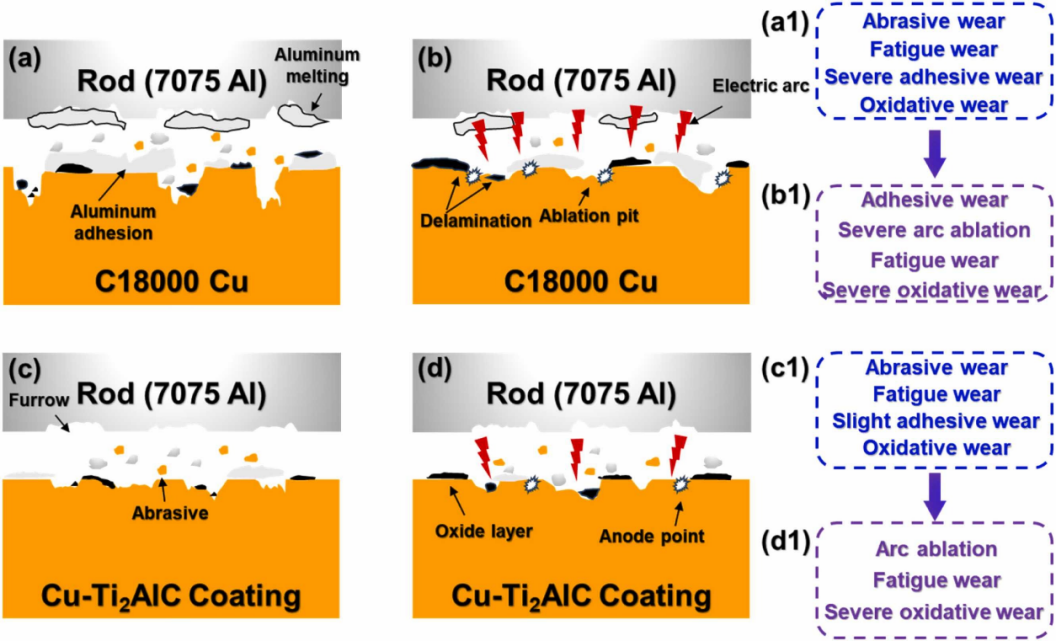 钛合金与铜合金作为现代工业中备受瞩目的高性能金属材料,因其各自优异的强度、耐腐蚀性及导电导热性,在航空航天、海洋工程及电子通讯等领域发挥着关键作用。然而,在严苛服役环境下耐磨性不足限制了其进一步推广应用。团队采用热喷涂技术分别在钛合金和铜合金表面成功制备出高性能耐磨防护涂层,为解决上述材料在极端环境中的磨损难题提供了创新思路与技术支撑。