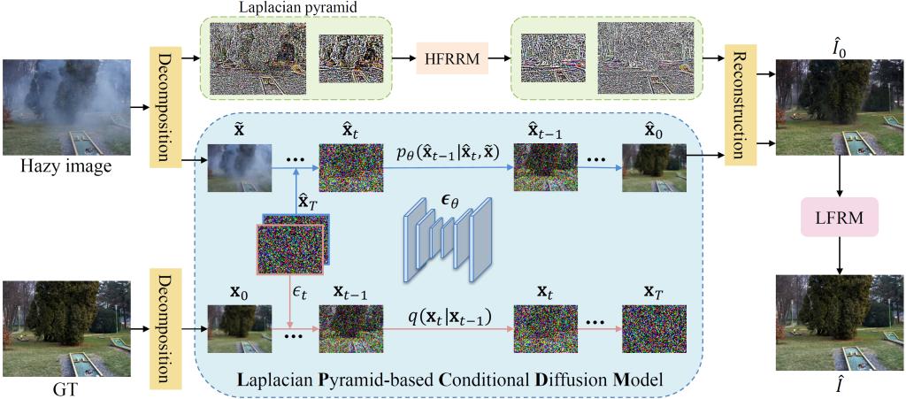 探索生成新范式,扩散模型实现高保真实景去雾。团队针对真实场景中复杂、非均匀的雾霾分布,传统去雾方法常因训练数据有限、域差异大而表现不佳,探索了一种基于生成式扩散模型图像去雾方法。研究提出一种拉普拉斯金字塔条件扩散模型用于真实场景图像去雾,并通过多尺度分解与精细化生成机制,在彻底去除雾霾的同时,尽可能保留图像的结构细节与色彩真实感。该模型是首次将拉普拉斯金字塔与条件扩散相结合,将输入图像分解为低频结构信息与高频细节残差,分别在低分辨率空间进行扩散去雾和高频重建,大幅提升了推理效率并避免了信息损失。此外,通过引入低频细化模块,进一步挖掘训练数据中的深层信息,增强了模型在真实雾霾场景下的复原性能。该方法在多个真实场景数据集(如NH-HAZE、Dense-HAZE等)上进行了系统验证,在PSNR、SSIM等客观指标与视觉质量上均明显优于现有主流方法。实验结果表明,该研究在保持高保真复原效果的同时,推理速度较传统扩散模型提升约150倍,为实现高效、高质的真实场景图像去雾提供了可行的生成式复原新思路。相关成果发表在多媒体领域顶级期刊《IEEE Transactions on Multimedia》,王永振博士为论文第一作者,刘恒教授为通讯作者。