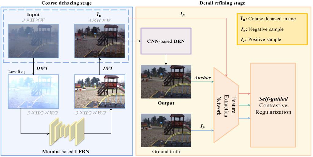 利用Vision Mamba架构赋能图像去雾。团队通过对雾霾图像进行小波变换分析,首次明确揭示了雾霾退化信息主要集中分布于图像的低频分量中,突破了传统端到端的去雾范式,提出了“先恢复全局结构,再增强局部细节”的粗-精两阶段解耦框架。第一阶段设计了一种基于Vision Mamba的低频恢复网络,Mamba模块凭借其线性复杂度的全局建模能力,专门负责消除弥漫性的雾霾,恢复图像的整体对比度与基础结构,得到一张粗略去雾结果。第二阶段设计了一个CNN细节增强网络,专注于从频域和空间域中挖掘并修复在第一阶段可能丢失的高频纹理与边缘信息。为了进一步提升模型复原效果的自然度与真实性,研究还提出了一个巧妙的“自引导对比正则化”策略。该策略将第一阶段产生的粗略去雾结果作为一种“有难度的负样本”,迫使网络最终的输出在特征空间中远离这个仍有缺陷的中间结果,从而更精准地向清晰无雾的图像靠近。这些设计使得WDMamba不仅在合成与真实雾霾数据集上取得了领先的定量结果,更在视觉上实现了细节保留与色彩保真的优异平衡,为复杂场景下的高效图像去雾提供了新颖且有效的解决方案。相关成果发表在视频技术与电路系统领域顶级期刊《IEEE Transactions on Circuits and Systems for Video Technology》,王永振博士为通讯作者,硕士研究生孙杰为第一作者。