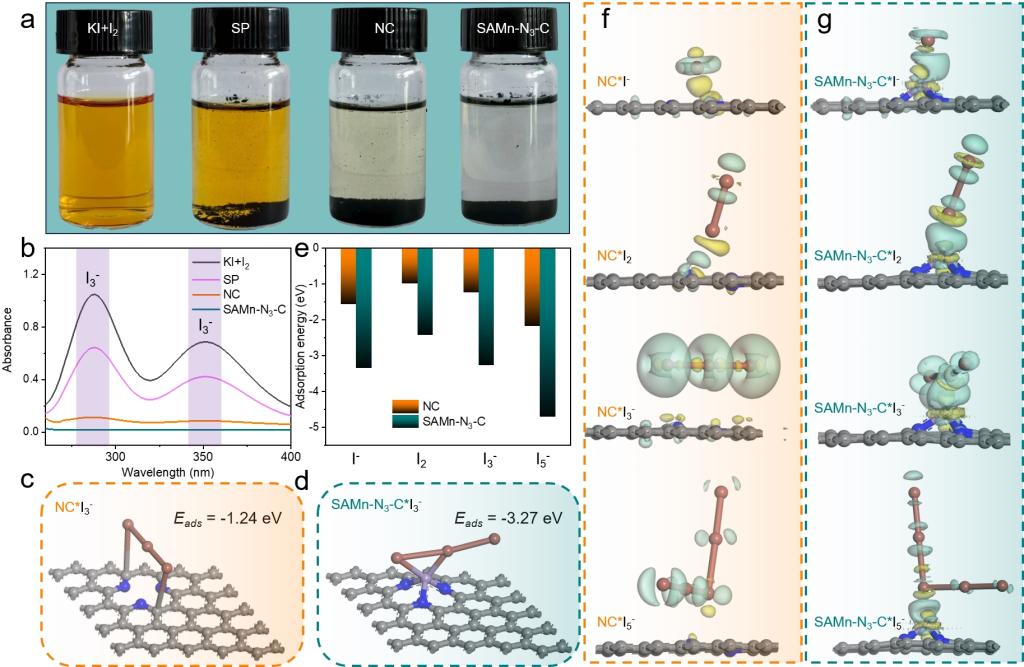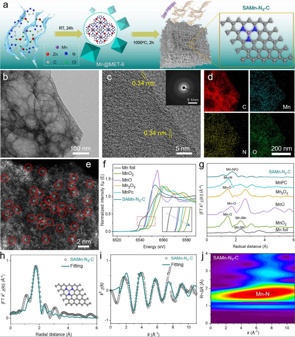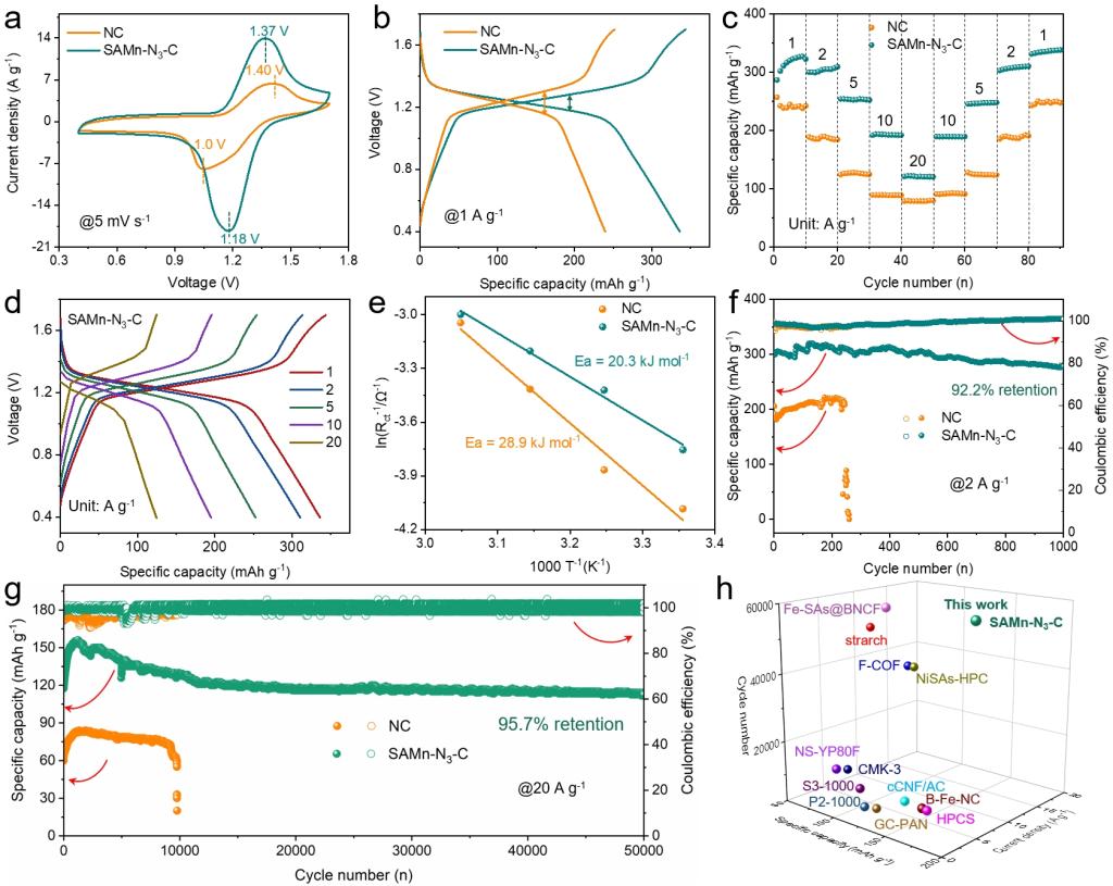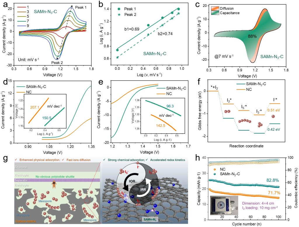 研究开发了一种高N掺杂介孔碳负载Mn单原子(SAMn-N3-C)正极材料,用于电解质Zn-I2电池。该材料不仅可以通过物理化学作用锚定碘物种,抑制多碘化物穿梭,同时不饱和配位的Mn-N3可以进一步增强对各类碘物种的有效吸附,并通过降低碘转化化学中速率决定步骤的吉布斯自由能,加速反应动力学,增强转化效率。这种多功能碘宿主材料具有的协同作用显著提升了Zn-I2电池的性能,在1 A g-1时容量达到336.2 mAh g-1,并可稳定工作50,000个循环。研究通过将单原子催化剂与多孔结构相结合,建立了具有物理化学限域和高效转化协同作用的碘宿主材料新方法,推动Zn-I2电池技术在实际应用中的进一步发展。