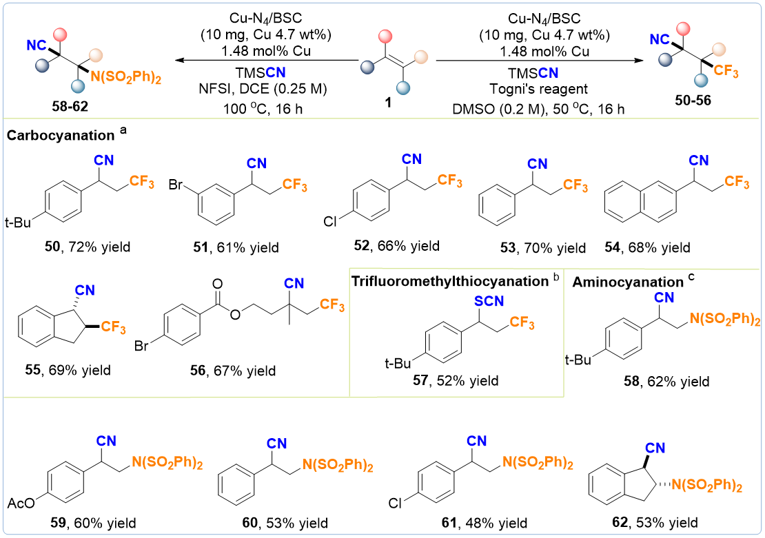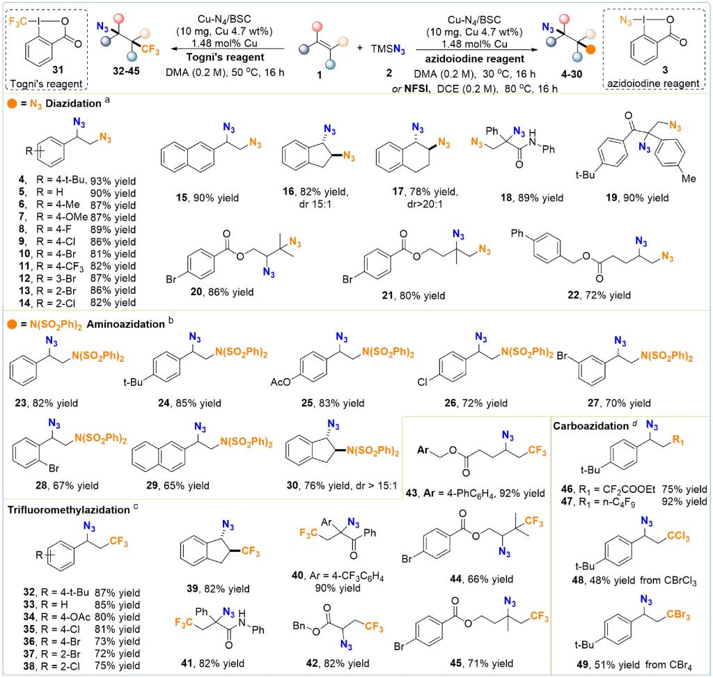针对上述问题,曾杰教授团队开发了一种碗状碳负载的单原子铜催化剂(Cu–N4/BSC)。该催化剂通过模板辅助配位吸附–碳化策略构筑,使铜原子以单原子形式锚定于碳载体表面,形成高度均一的 Cu–N4配位结构。通过调控反应条件,同一催化剂体系可实现五种不同类型的烯烃的双官能化反应,包括双叠氮化、胺-叠氮化、三氟甲基-叠氮化、三氟甲基-氰化以及胺-氰化反应。该催化体系适用于较为广泛的底物范围(共58个实例),最高产率可达93%,并在环状烯烃反应中表现出较高的非对映选择性(dr > 15:1)。