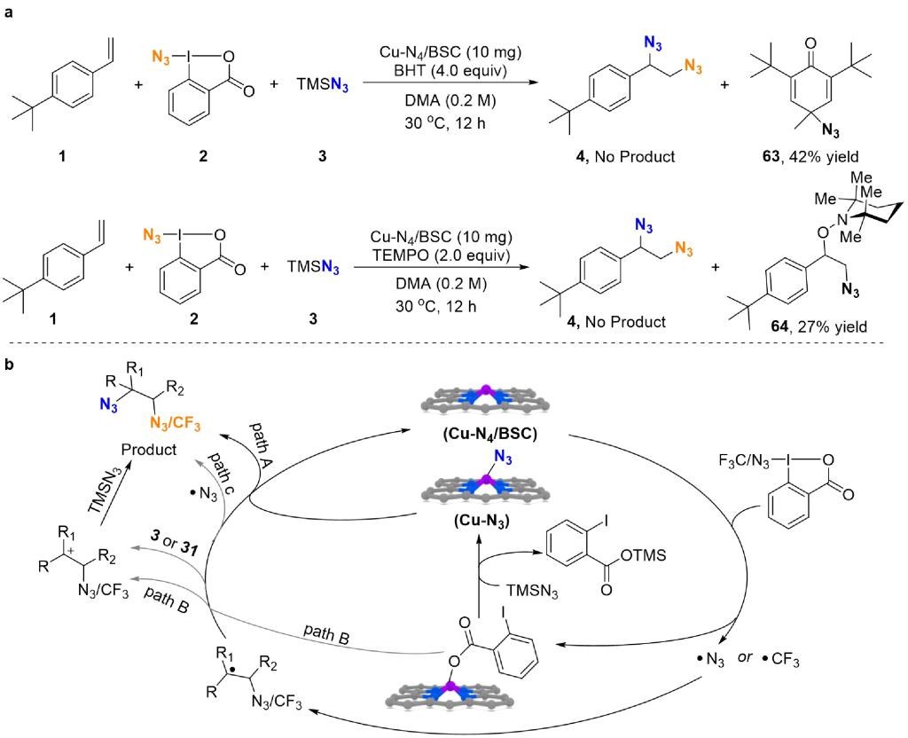 有机叠氮化物和腈类化合物是药物分子、农药及功能材料中的重要结构单元。然而,如何通过烯烃的双官能化反应实现这类化合物的高效与模块化合成,同时兼顾催化剂的可回收性,仍是合成化学领域关注的问题。传统均相催化体系通常具有较高的反应效率,但催化剂回收利用较为困难;相比之下,尽管多相催化体系在分离与回收方面具有优势,但利用同一催化剂平台实现多种反应模式的烯烃的双官能化转化的研究仍有待进一步拓展。